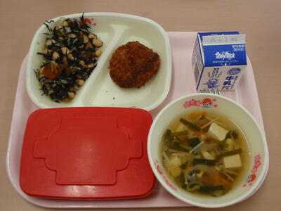 今日の給食の献立は、「ごはん 牛乳 メンチカツ ひじきの炒め煮 にらのすまし汁」でした。