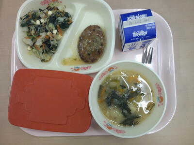 今日の給食は、ハンバーグとひじき、味噌汁でした。