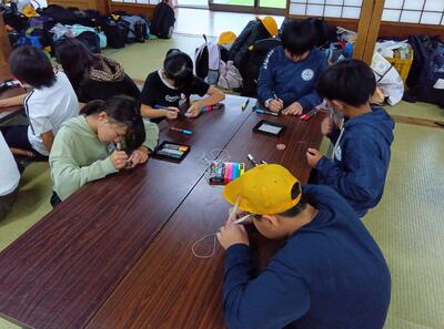 ぶんぶんごま作りです。自分の好きな絵や模様を木に描いています。
