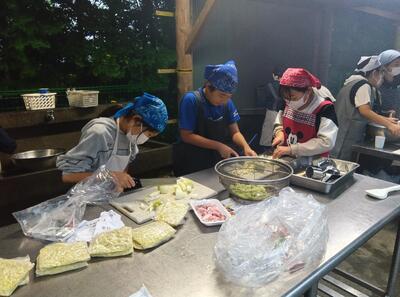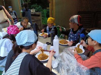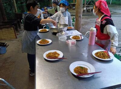 野外炊飯焼きそば作りです。美味しい焼きそばを作っています。