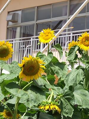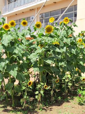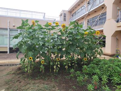 学年菜園の様子です。ひまわりが大変大きくなり、高さが3メートルを超えています。その前にあるホウセンカも1メートルを超えて、ぐんぐん元気に育っています。