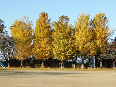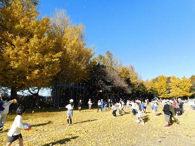 ハラハラと一斉に葉を散らし始め、校庭は黄色一面に染まり、児童たちもその変化に歓声を上げていました。