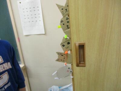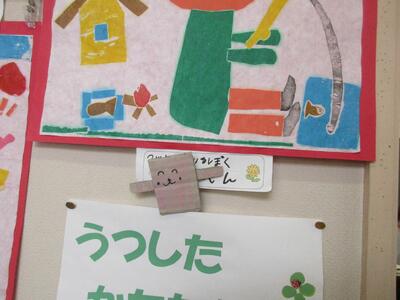 1年生の図画工作科で、段ボールとモールを使い、「すきまちゃん」を作りました。「すきまちゃん」は、すきまが大好き! 好きな場所にすきまちゃんをはさみ、楽しみました。