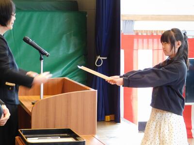 代表児童が修了書を受け取ったり、作文を発表したりしました。